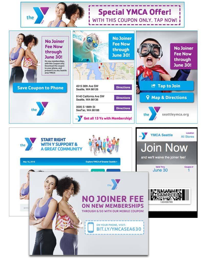 Rich media mobile campaigns added extra functionality, such as saving an iOS coupon to Apple Wallet, a multi-location finder with map, and a standard expandable with tap zones. In addition, we created email blast graphics and a direct mail piece consistent with the creative. Mobile campaigns helped YMCA find new customers, while engaged users were rewarded with waived joiner fees.